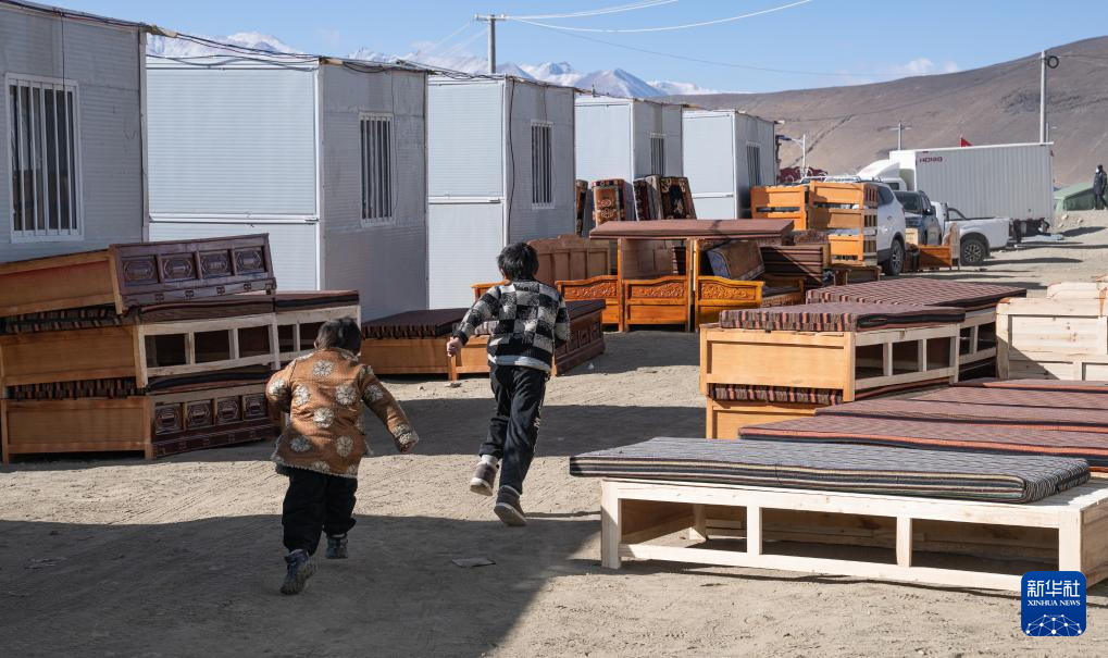 在定日縣長所鄉(xiāng)嘎旦村,兩個孩子在剛運來的兩排藏床間奔跑(1月13日攝)。新華社記者 丁增尼達 攝