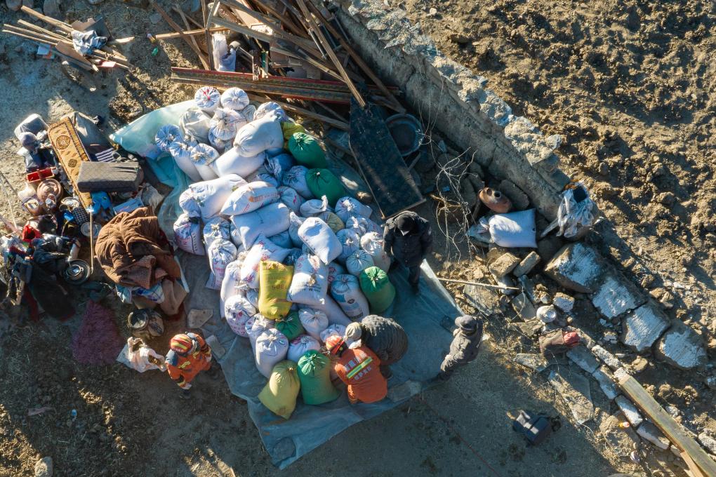 1月13日,在定日縣長所鄉古榮村,消防員們在整理從廢墟中搶救出的青稞(無人機照片)。新華社記者丁增尼達 攝