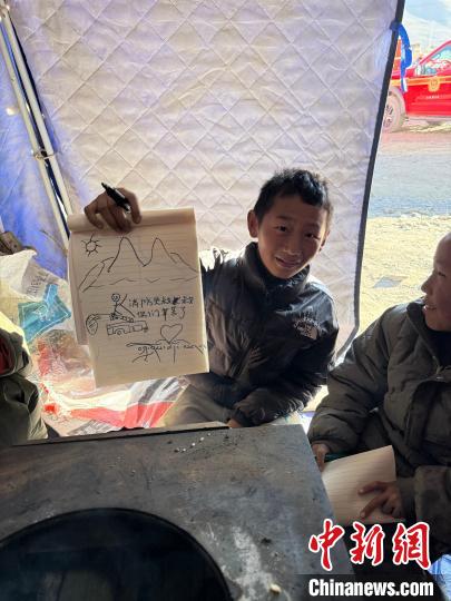 多吉擔(dān)心地震給孩子們帶來(lái)心理陰影,為了讓他們樂(lè)觀度過(guò)這段時(shí)間,多吉整理了單位用來(lái)存放物資的帳篷作為畫畫的地方,又特意托加油站工作人員為孩子們購(gòu)買了彩筆和畫本。