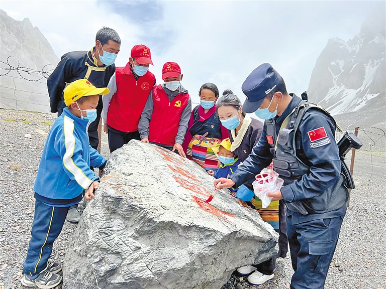 拉青拉山口是吉隆縣貢當鄉境內4座通外山口之一,也是中尼傳統邊貿通道,地形條件極其復雜。李錦一介紹,為增強黨員干部、邊境群眾和社會各界對國家安全、邊境穩定的關心關注,貢當鄉創新思路開展“國旗插在最前沿 我為祖國守邊關”系列活動。活動定期邀請任職干部、返鄉探親干部、休假返鄉軍人、節假日在鄉學生等一同參與界樁描紅、同升國旗、邊境巡邏等各類活動,讓更多人參與到守護邊疆的行動中來。