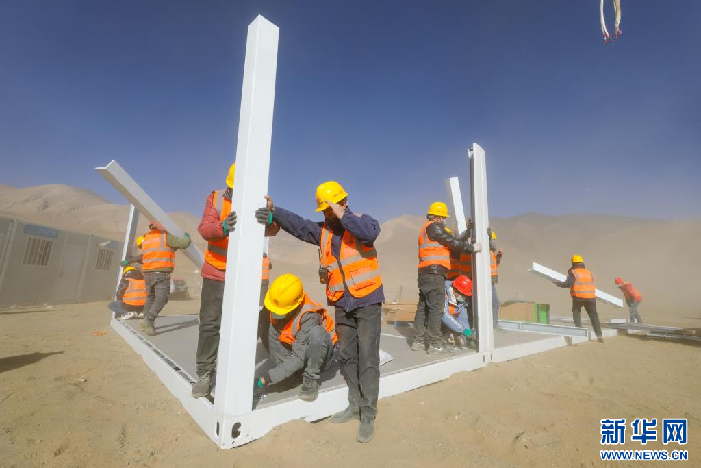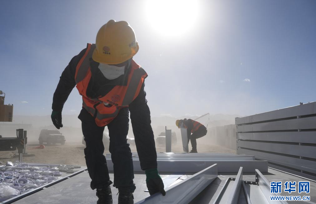 1月9日,中鐵二十局施工人員頂著風沙在長所鄉森嘎村安裝活動板房 。新華社記者 晉美多吉 攝