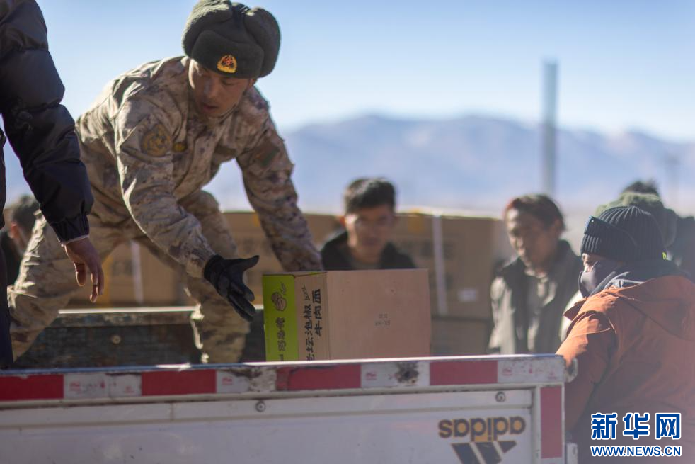 1月9日,救援人員在拉孜縣拉孜鎮措布村卸載救災物資。新華社記者 姜帆 攝