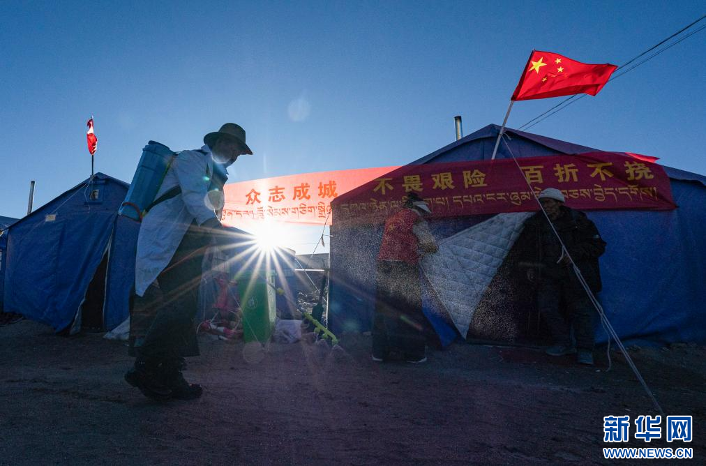 1月10日,在定結縣郭加鄉乃村安置點,村民在進行消殺工作。 新華社記者 丁增尼達 攝