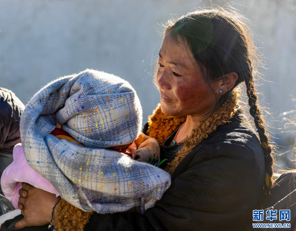1月8日,定日縣長所鄉通來村的受災群眾措姆抱著自己的孩子在領取志愿者送來的御寒衣物。新華社記者 姜帆 攝