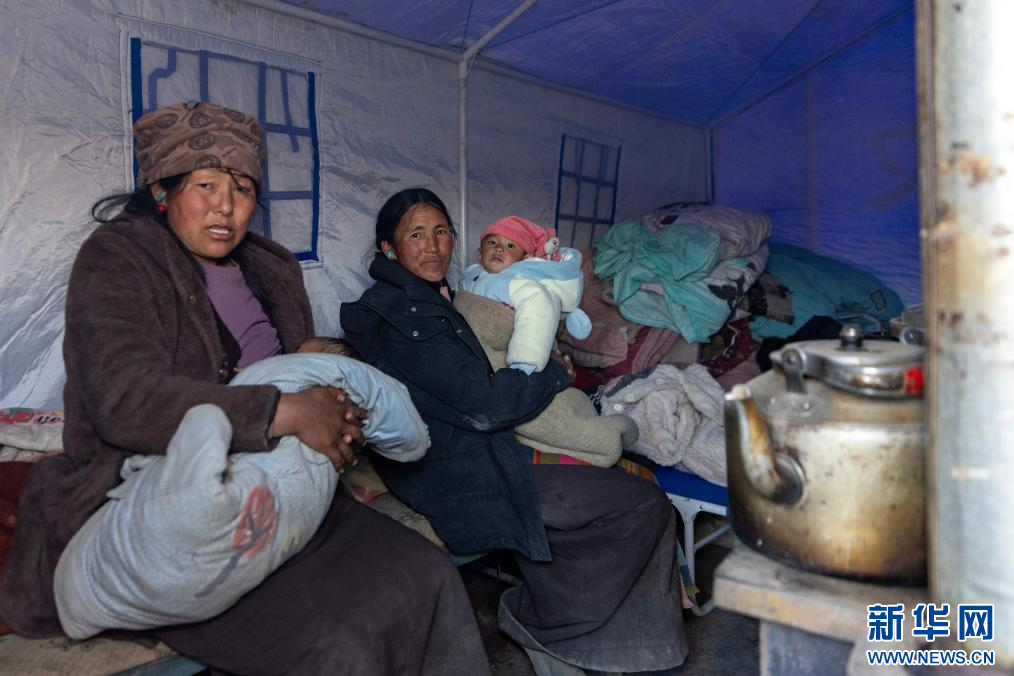 1月7日,兩位抱著孩子的受災群眾在拉孜縣曲下鎮土林村的應急帳篷里取暖。新華社記者 姜帆 攝