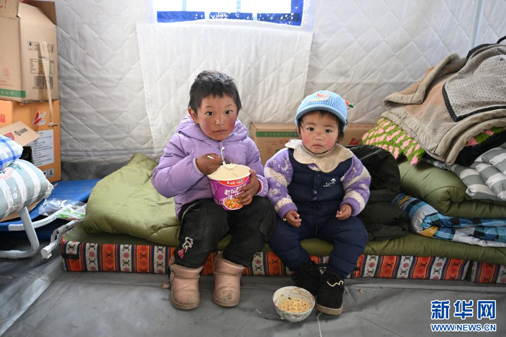 1月9日,拉孜縣芒普鄉一處安置點內,小朋友在溫暖的帳篷里吃泡面。新華社記者 李響 攝