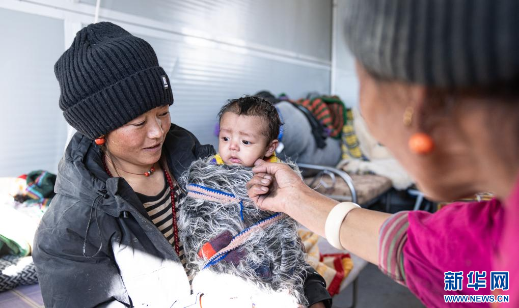 1月8日,在長所鄉森嘎村臨時安置點,西藏軍區總醫院醫療隊隊員為小朋友治療。 新華社記者 丁汀 攝