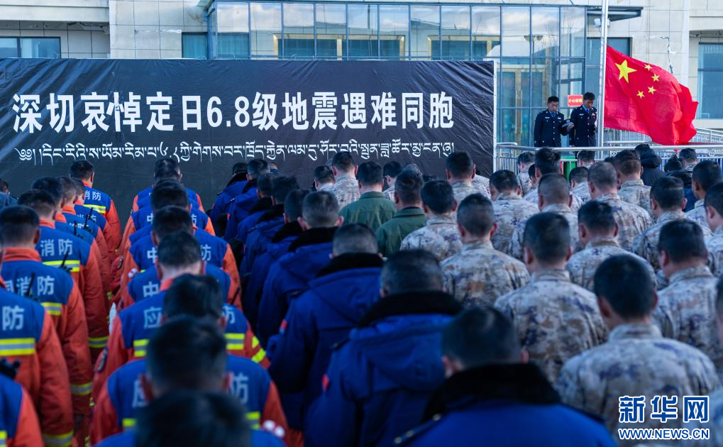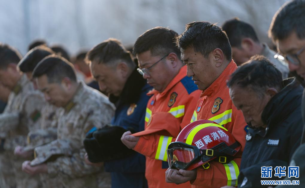 1月13日上午9時30分,西藏定日6.8級地震遇難同胞悼念儀式在受災最嚴重的長所鄉舉行。參與救援的解放軍和武警官兵、消防救援人員、公安民警、醫護人員、青年志愿者及有關企業員工、干部職工、震區群眾代表數百人,脫帽肅立,向遇難同胞默哀3分鐘。 新華社記者 丁增尼達 攝