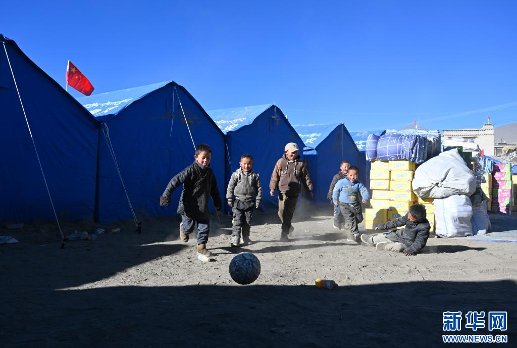 1月11日,薩迦縣麻布加鄉普村安置點的小朋友在踢球。新華社記者 李響 攝