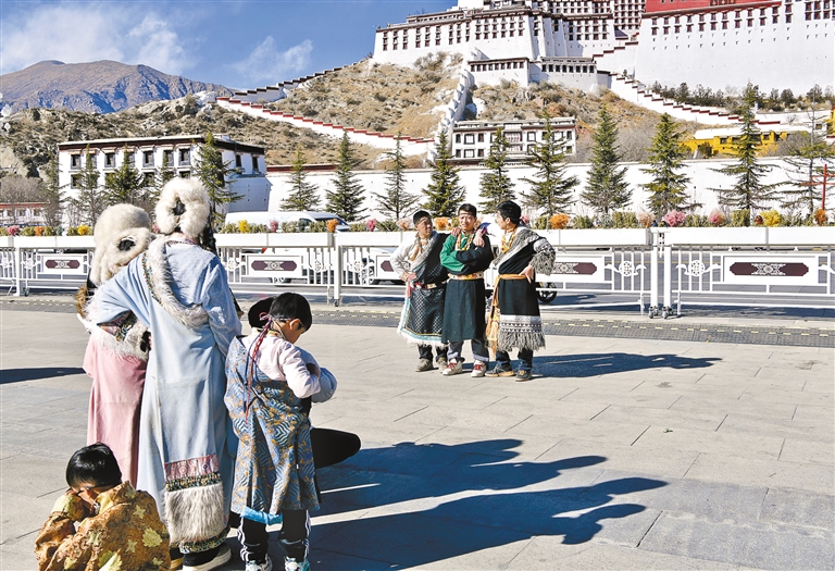 游客在布達拉宮廣場拍照留念。記者 王敏 攝