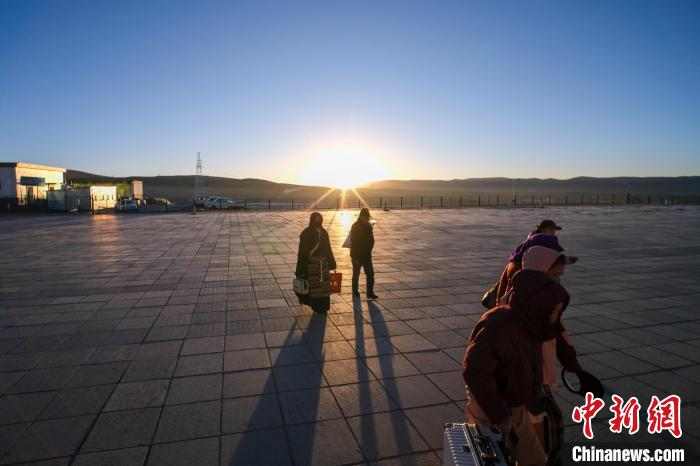 2月3日日出時分,西藏那曲安多民眾到達安多火車站,準備進站乘車。中新社記者 江飛波 攝