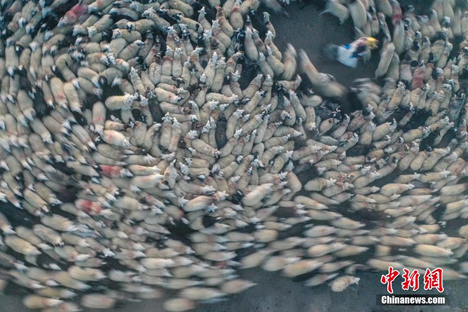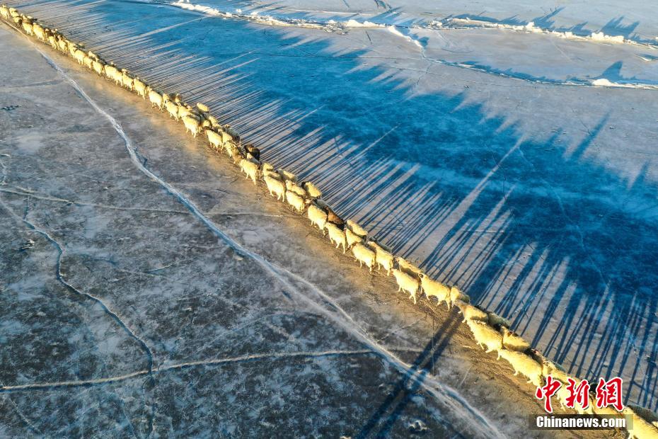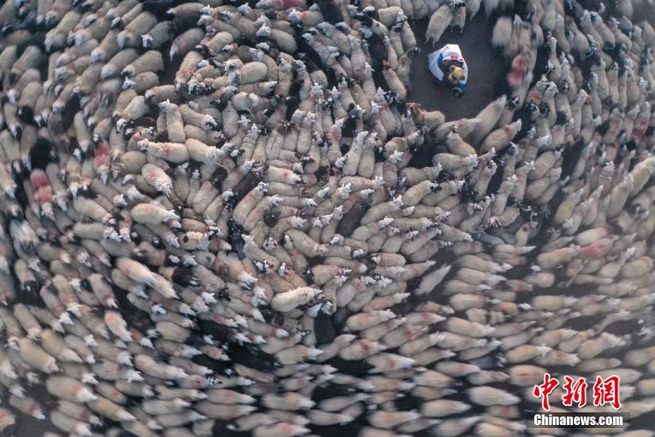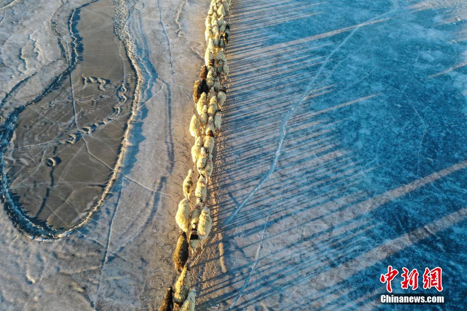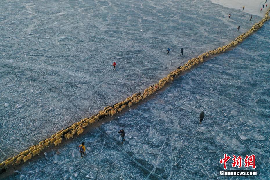 2月7日,西藏山南市浪卡子縣推瓦村1400多只羊通過普莫雍錯冰湖,前往湖心島。據悉,位于西藏山南市浪卡子縣的推瓦村,平均海拔約5070米,是世界上海拔最高的行政村,以牧業為主。由于推瓦村海拔高、夏季短,草場無法為羊群提供充足的過冬飼料,因此,每年高原最冷的時候,推瓦村牧民會把羊群趕到普莫雍錯水草豐茂的湖心島,依靠島上的草料度過最寒冷的冬期。圖為羊群通過普莫雍錯冰湖,前往湖心島。(無人機照片)中新社記者 貢嘎來松 攝