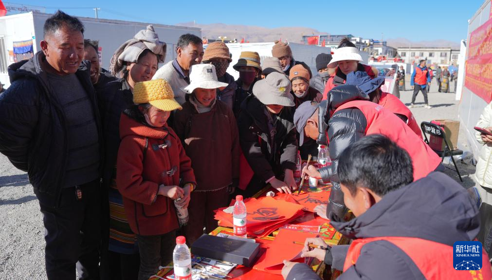 1月26日,書法家協會的志愿者在拉孜縣吉如村安置點為受災群眾書寫春聯。新華社記者 晉美多吉 攝