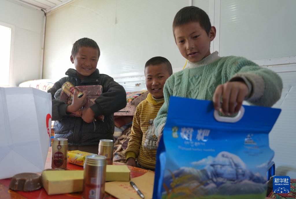 1月27日,拉孜縣加嘎村安置點受災群眾領到新年大禮包。新華社記者 晉美多吉 攝