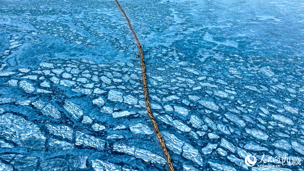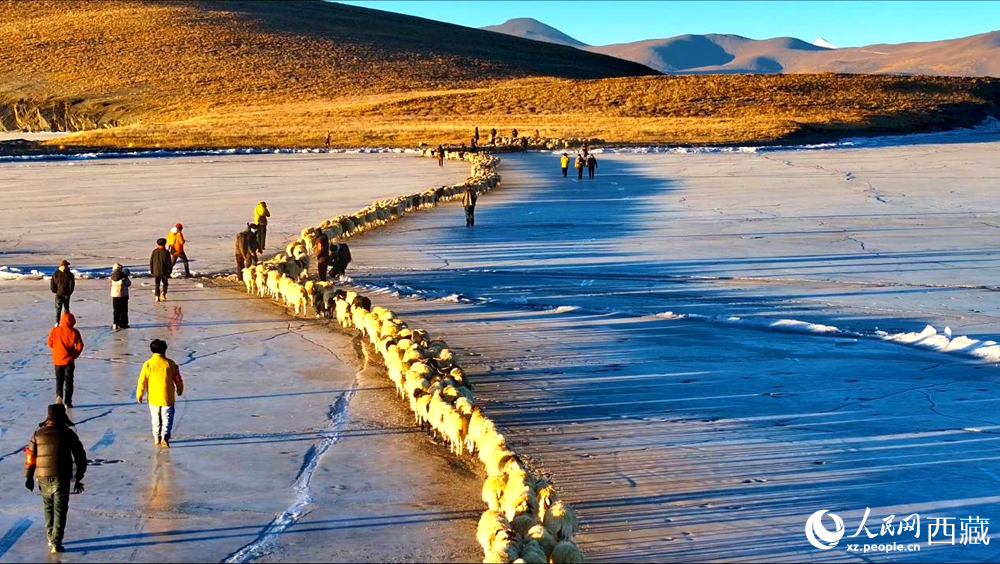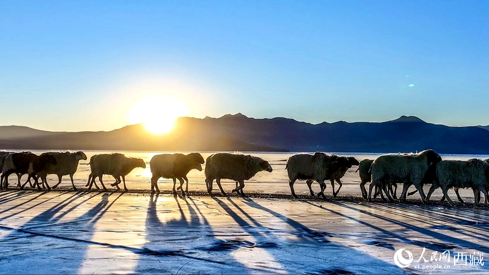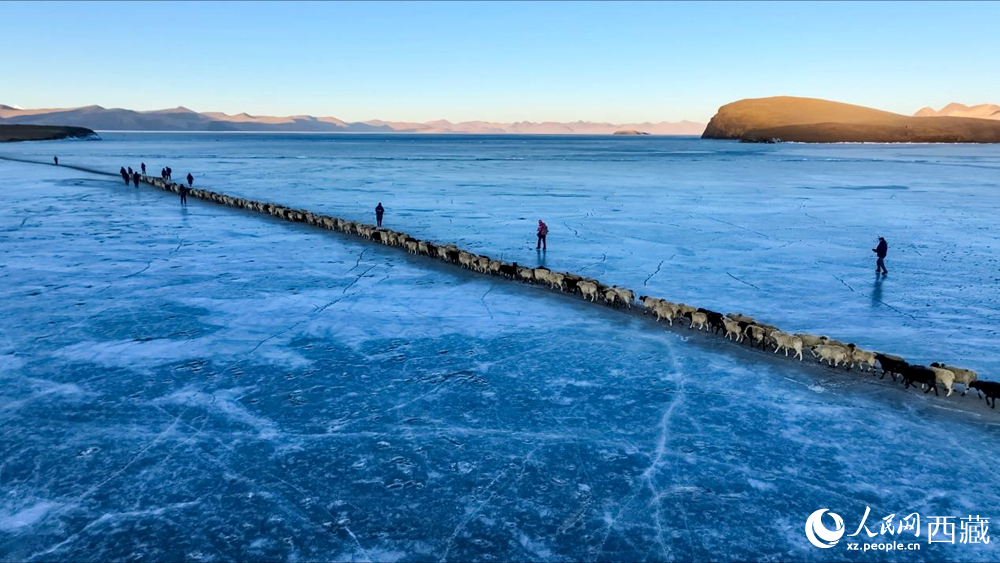 隨著一聲號(hào)令,牧民們驅(qū)趕著羊群,踏上冰封的湖面。遠(yuǎn)遠(yuǎn)望去,羊群如同一串串黑白相間的珍珠,在湛藍(lán)的冰面上緩緩移動(dòng),構(gòu)成一幅壯美的高原畫(huà)卷。