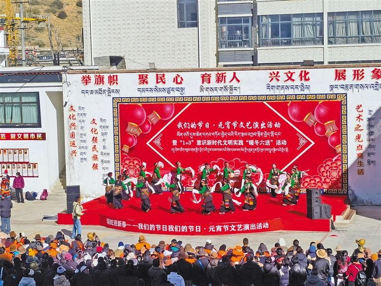 由日喀則市文旅局主辦、日喀則市群眾藝術館承辦的“我們的節日·元宵節文藝演出活動暨‘1+3’意識新時代文明實踐‘暖冬六送’活動”,在日喀則市群眾藝術館院內舉行。活動在舞蹈《阿吉朗薩》中溫暖開場,《歡樂日喀則》《心中的祝福》《中國夢》等節目掀起了活動的高潮,觀眾們手中揮舞的五星紅旗表達了對祖國母親的熱愛之情和對幸福生活的感恩之情。