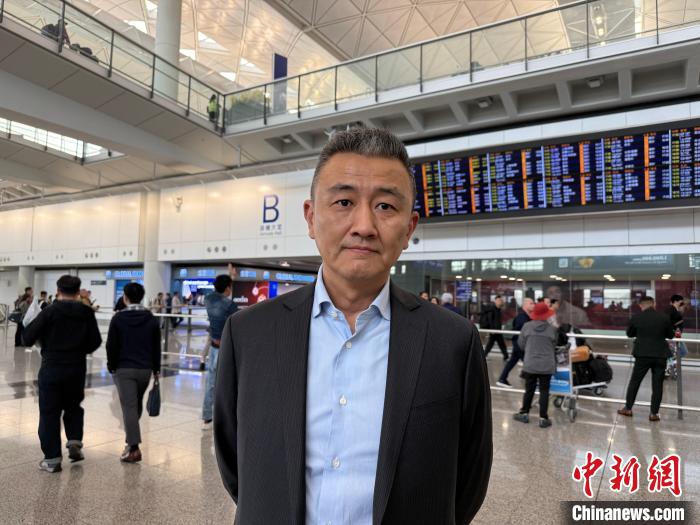 2月19日,西藏航空“拉薩-成都天府-香港”航線開通。圖為西藏航空副總經理張兵兵在香港國際機場抵港大堂接受中新社記者采訪。中新社記者 韓星童 攝