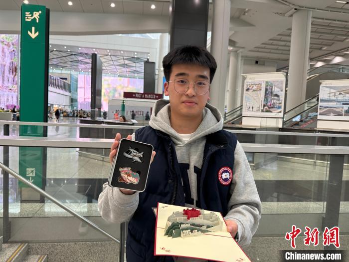 2月19日,西藏航空“拉薩-成都天府-香港”航線開通。圖為首航乘客曾帥向記者展示航空公司派發的首航紀念徽章和立體賀卡。中新社記者 韓星童 攝