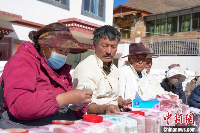 圖為西藏左貢縣亞中村農牧民分紅現場。普布朗杰 攝