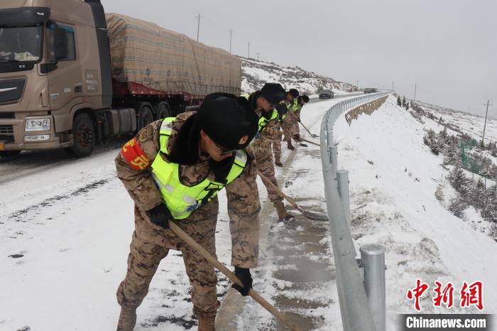 在嚴寒天氣里,武警官兵克服高寒缺氧的惡劣環境,累計清雪5500余立方米,解救滯留車輛200余輛,恢復道路暢通。