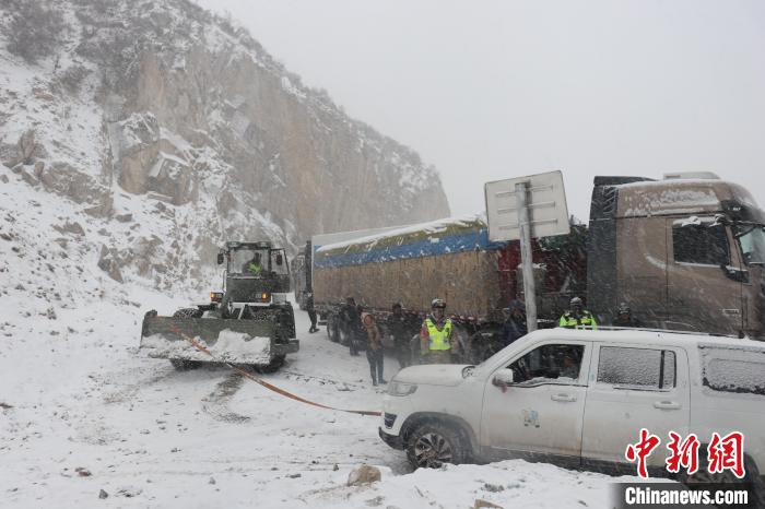 據了解,災情發生后,擔負該路段養護保通任務的武警第二機動總隊某支隊官兵迅速啟動道路除雪保通預案,抽組專業救援力量及大型救援裝備趕赴受阻路段實施搶通。受阻路段平均海拔處于4000米以上,持續降雪不斷,官兵們首先對滯留人員進行安撫,并發放食物和藥品等救援物資,為盡快清理路面積雪,官兵采取“機械協同先通后擴、人機配合高效救援”的方式同步展開作業。期間,一輛重載半掛車不慎陷入邊溝中,指揮員果斷調整方案,封控現場、撒布融雪劑、清理四周積雪、鋼絲繩牽引等步驟緊張有序的進行中……伴隨著發動機的轟鳴聲,車輛被成功救出。