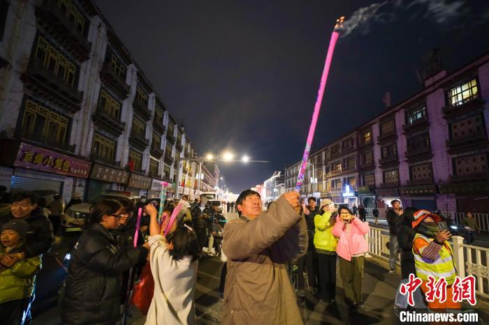 藏歷新年是西藏傳統民俗活動,也是中國國家級非物質文化遺產。2月27日,西藏迎來一年一度的藏歷新年古突夜(類似春節的除夕),如今過古突夜,西藏民眾在點燃火把的同時,也會燃放煙花,古城拉薩煙花璀璨。圖為2月27日晚,拉薩當地民眾與游客等在街頭共同慶祝藏歷木蛇新年的到來。中新社記者 江飛波 攝