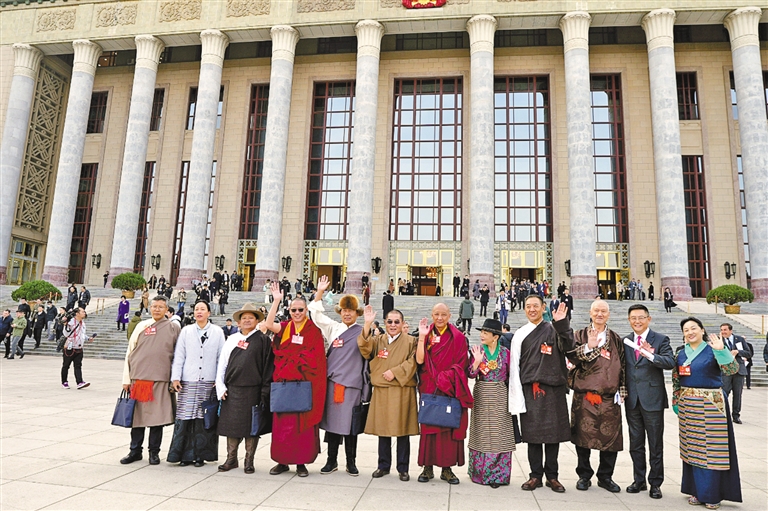 圖為住藏全國政協委員身著盛裝、滿懷豪情,在人民大會堂前合影留念。記者 丹增平措 攝