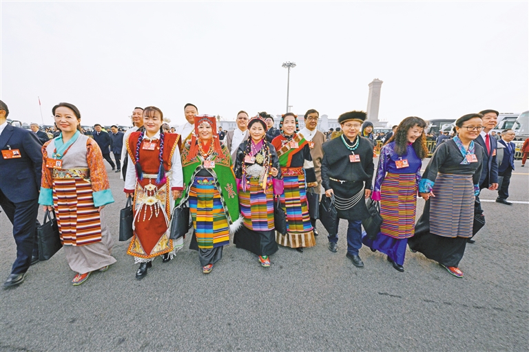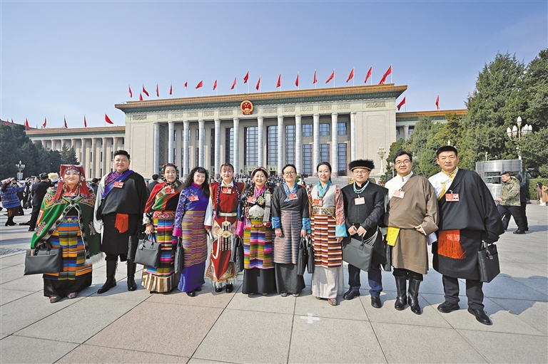 全國人大代表聆聽政府工作報告后,在人民大會堂前合影留念。記者 旦增西旦 攝