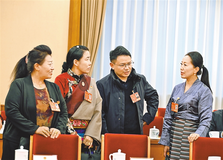 全國人大代表在會議間隙交流審議內容。