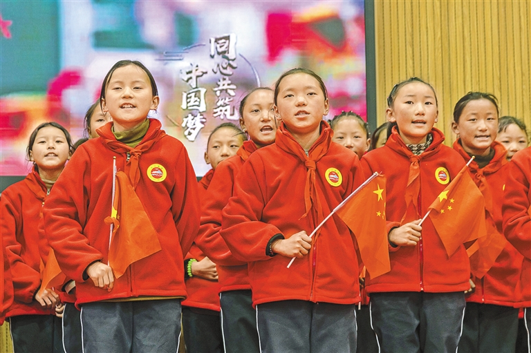 圖為3月5日,來(lái)自受災(zāi)最嚴(yán)重的定日縣長(zhǎng)所鄉(xiāng)、措果鄉(xiāng)、曲洛鄉(xiāng)的3所小學(xué)的學(xué)生在開(kāi)學(xué)典禮上演唱歌曲《同心共筑中國(guó)夢(mèng)》。新華社記者 姜帆 攝
