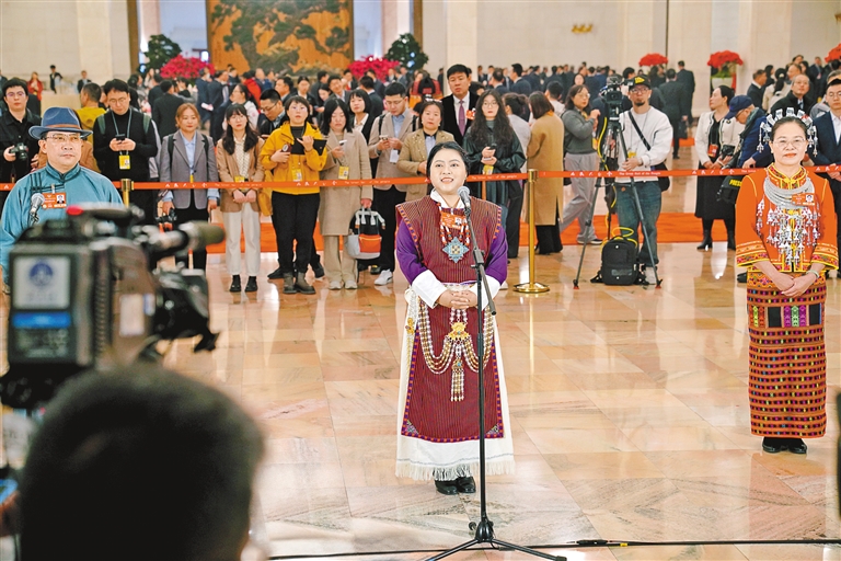 圖為住藏全國政協委員白瑪玉珍(中)在“委員通道”上介紹墨脫的發展變化。記者 旦增平措 次旦央吉 攝