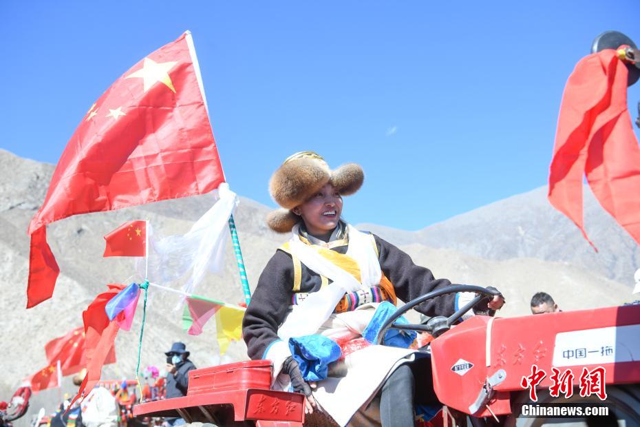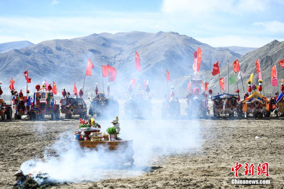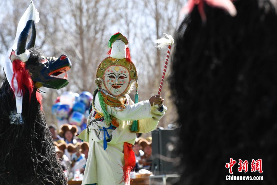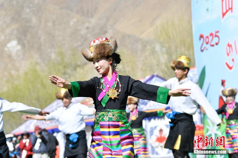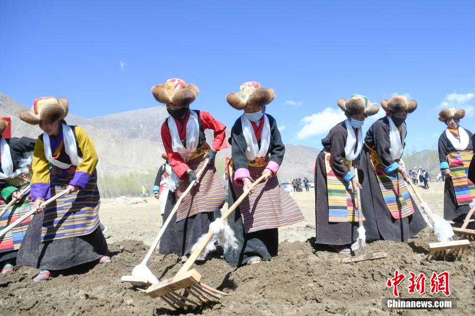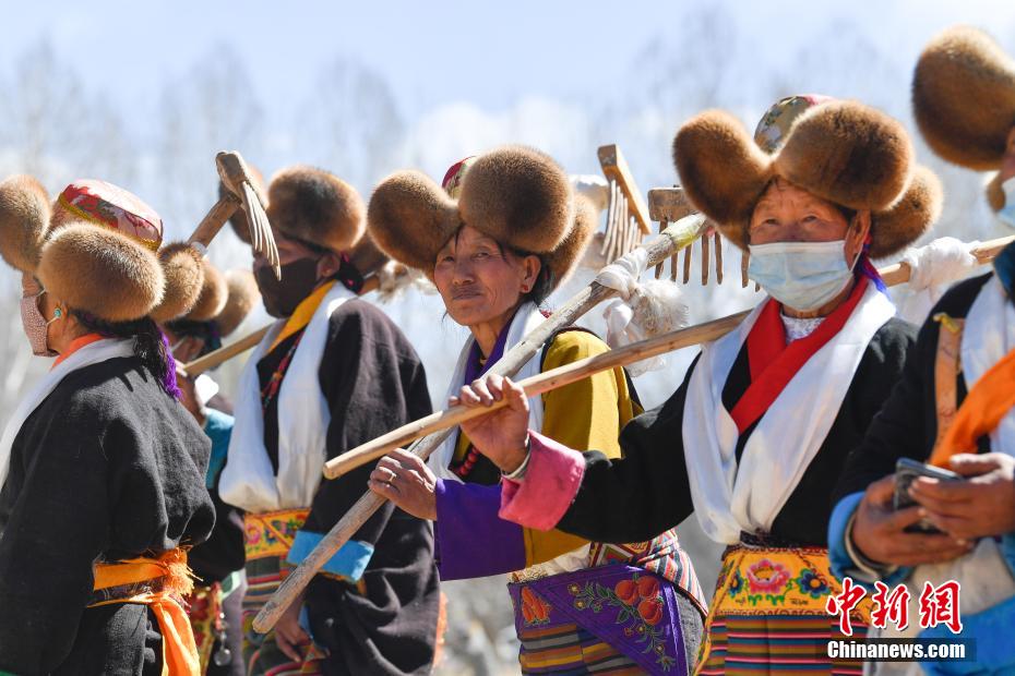 3月16日,西藏拉薩迎來一年一度的傳統春耕儀式。當日,拉薩市曲水縣色達村村民身著節日盛裝,相聚在田間,載歌載舞,共同迎接春耕第一犁。家家戶戶端著自家的“切瑪”(象征五谷豐登)帶著青稞酒、酥油茶等物品聚在田間,互敬青稞酒,開始撒種,祈求全年風調雨順、五谷豐登。圖為曲水縣色達村春耕儀式現場,當地民眾表演國家級非物質文化遺產《吉祥仲孜》。中新社記者 貢嘎來松 攝