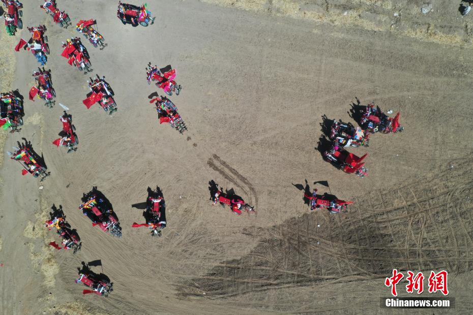 3月16日,西藏拉薩迎來一年一度的傳統春耕儀式。當日,拉薩市曲水縣色達村村民身著節日盛裝,相聚在田間,載歌載舞,共同迎接春耕第一犁。家家戶戶端著自家的“切瑪”(象征五谷豐登)帶著青稞酒、酥油茶等物品聚在田間,互敬青稞酒,開始撒種,祈求全年風調雨順、五谷豐登。圖為曲水縣色達村春耕儀式現場(無人機照片)。中新社記者 貢嘎來松 攝