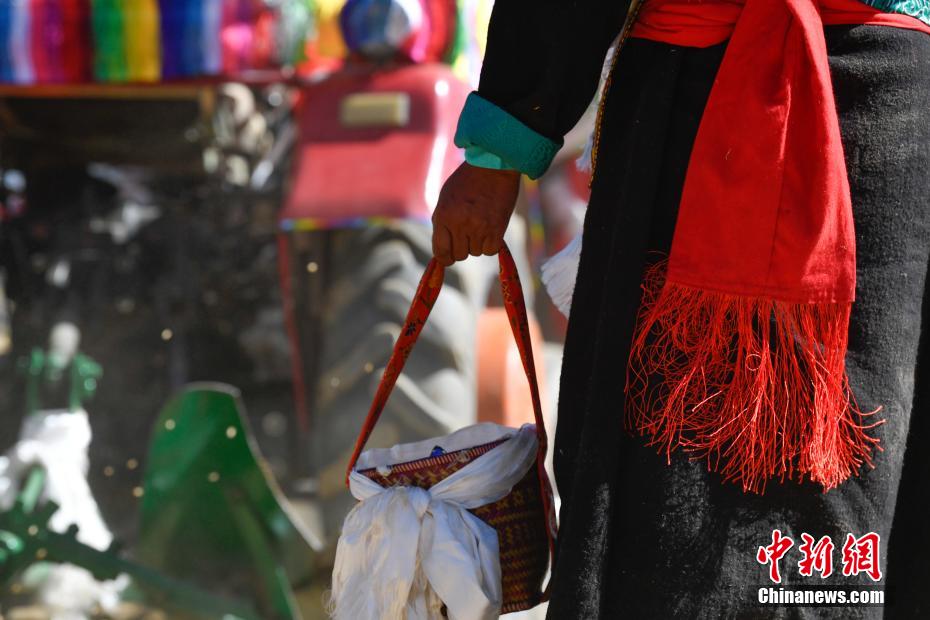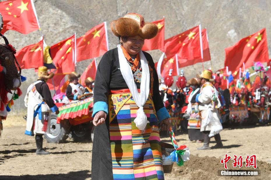 3月16日,西藏拉薩迎來一年一度的傳統春耕儀式。當日,拉薩市曲水縣色達村村民身著節日盛裝,相聚在田間,載歌載舞,共同迎接春耕第一犁。家家戶戶端著自家的“切瑪”(象征五谷豐登)帶著青稞酒、酥油茶等物品聚在田間,互敬青稞酒,開始撒種,祈求全年風調雨順、五谷豐登。圖為曲水縣色達村春耕儀式現場。中新社記者 貢嘎來松 攝