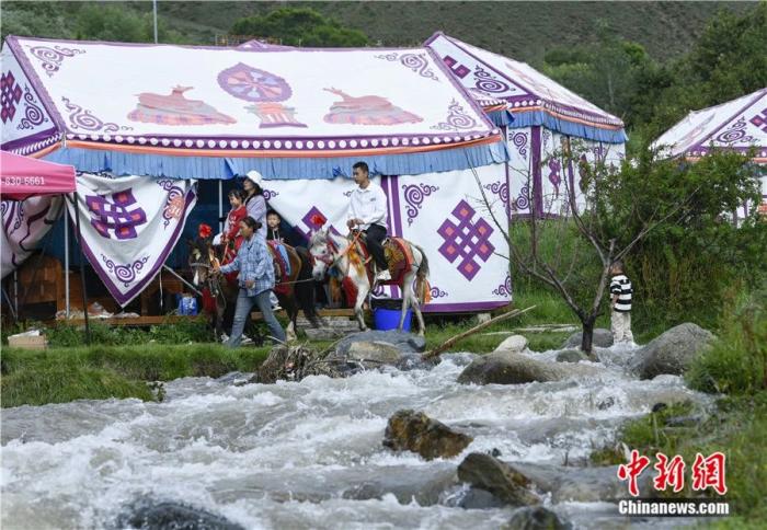 2024年7月28日,市民在位于西藏自治區拉薩市堆龍德慶區的達東村“過林卡”。過林卡是藏族人最普遍的休閑娛樂方式,類似于郊游和野餐。中新社記者 貢嘎來松 攝