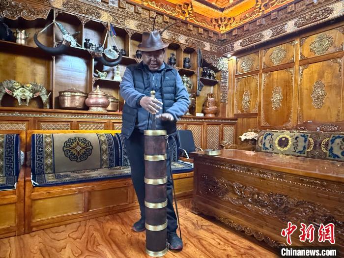 圖為米瑪頓珠在展示傳統的酥油桶。貢桑旺姆 攝