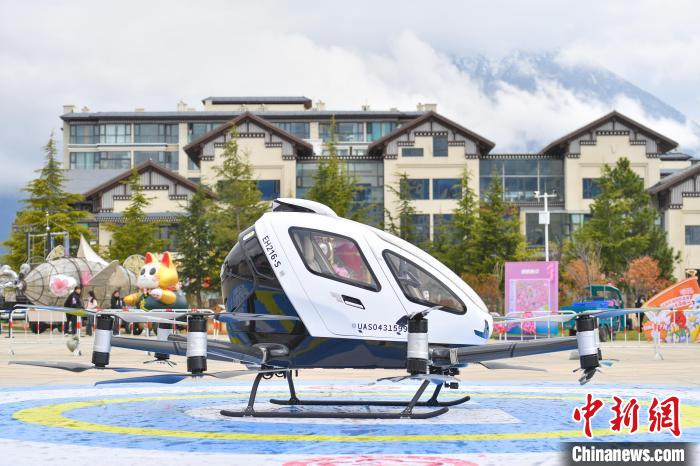 4月5日,西藏林芝第二十二屆桃花旅游文化節上,億航智能桃花載人無人機E-VTOL首次亮相海拔3000米高度,并成功首飛。首飛現場,無人機緩緩升空,引得市民、游客紛紛駐足仰望,降落之后,大家圍攏過來,近距離參觀體驗并拍照留念。據悉,億航智能已在國內合肥、杭州等地開展低空文旅項目,在全球19個國家,完成65000架次安全飛行。圖為載人無人機E-VTOL準備進行首次飛行。貢確 攝
