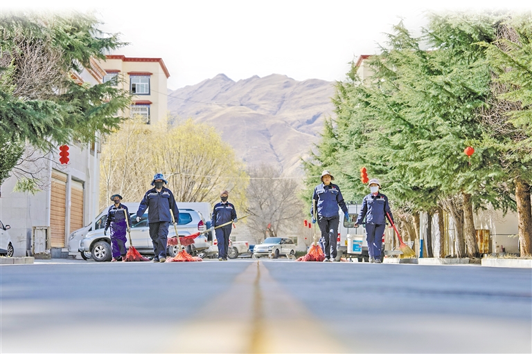 物業服務部保潔團隊在清掃小區道路。記者 阿旺尼瑪 攝