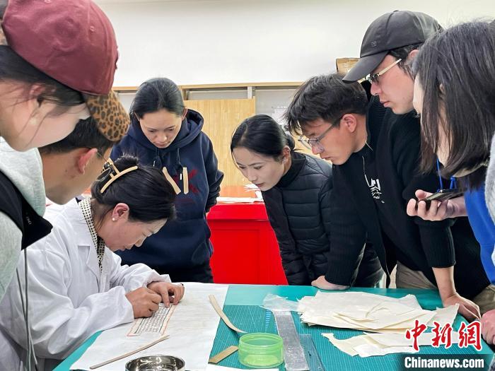 德吉曲珍向中新社記者介紹,修復藏文古籍,藏文功底和過硬技術同樣重要,能夠讓文字在修復中還原破損前的原貌。她還說:“課程中,學生用的仿真古籍都是我們在市面上買的梵夾裝書籍,材質、形制更接近于古籍。”