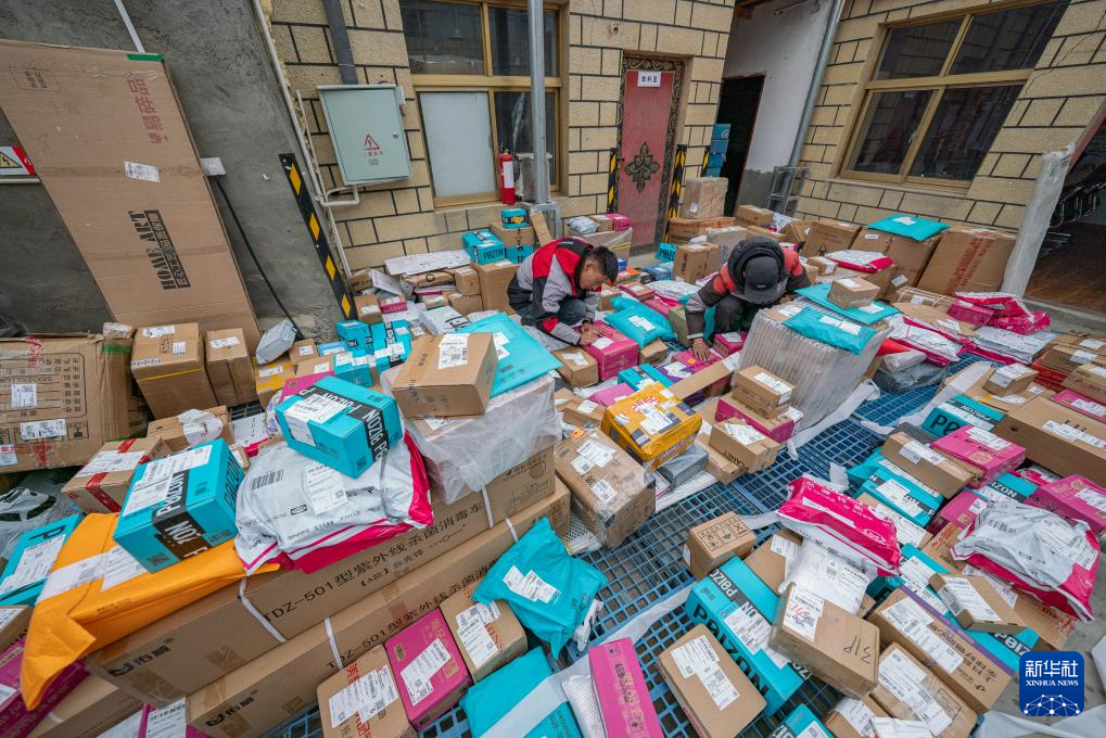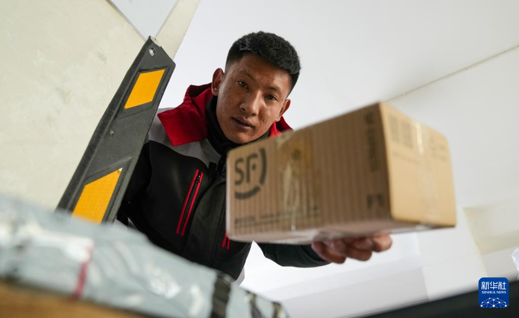 拉巴在站點內整理快遞(4月24日攝)。新華社記者 晉美多吉 攝