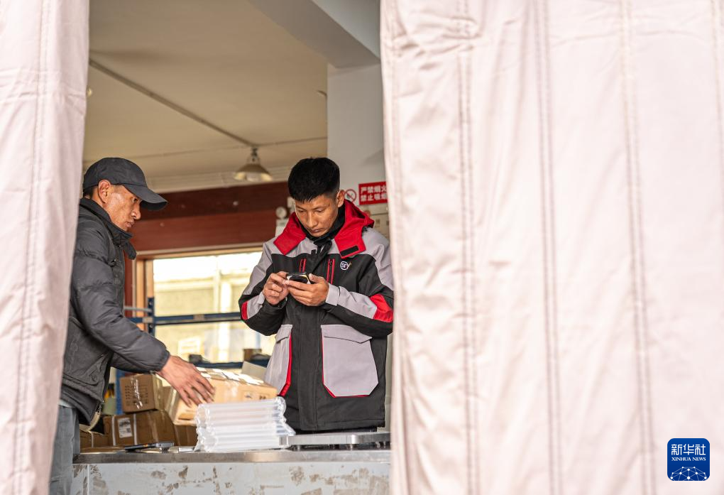 拉巴(左)在站點內查看快遞信息(4月24日攝)。新華社記者 晉美多吉 攝