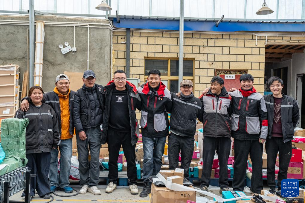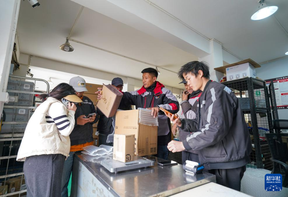拉巴(左四)在站點內打包快遞(4月24日攝)。新華社記者 晉美多吉 攝