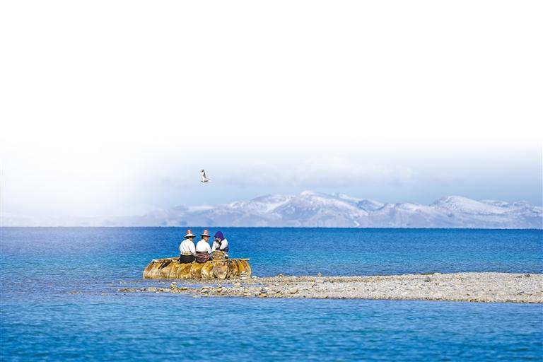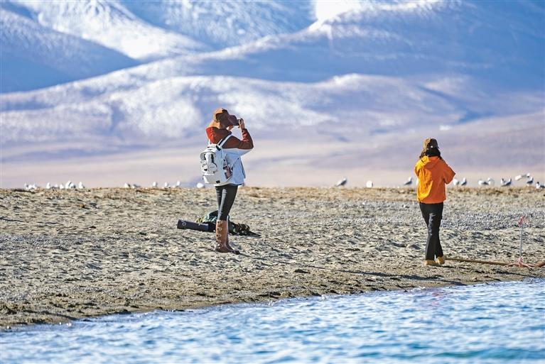 游客在納木錯打卡拍照。記者 阿旺尼瑪 貢曲羅杰 攝