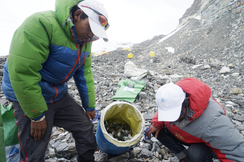 圖為西藏拉薩喜馬拉雅登山向導學校的向導們在珠峰進行垃圾清理(2016年5月21日攝)。 新華社發(扎西次仁攝)