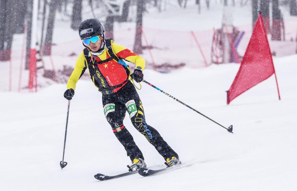 中國滑雪登山運動員玉珍拉姆在新疆富蘊縣可可托海國際滑雪度假區進行的全國首屆滑雪登山冠軍賽短距離(女子組)比賽中。(2023年4月8日攝)。新華社記者 胡虎虎 攝