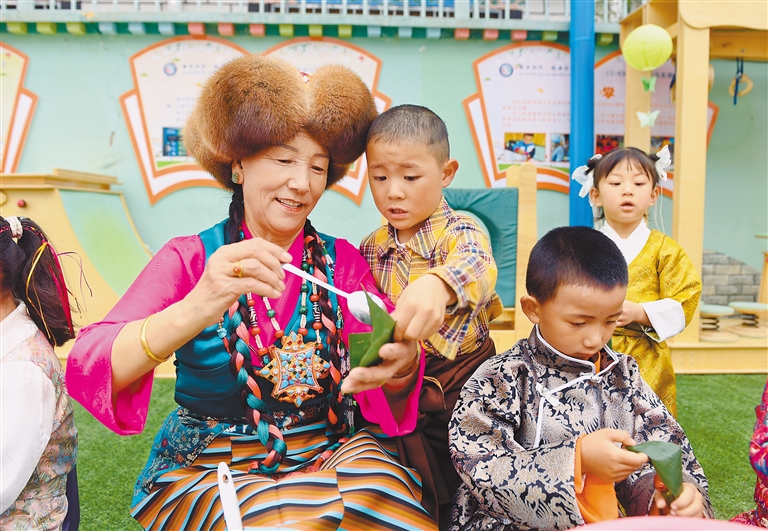 嘎瑪貢桑社區文藝隊隊員和拉薩市實驗幼兒園東城分園的孩子一起包粽子。