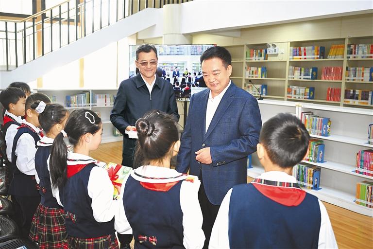 初夏,萬物并秀,生機勃發(fā),拉薩市實驗小學書聲瑯瑯。王君正走進校園,察看學校環(huán)境,參觀自然、閱讀、書法、體育等教育成果展示,了解學校歷史沿革、建設發(fā)展、教育教學等情況。他指出,習近平總書記高度重視、親切關懷少年兒童和少先隊工作,多次參加少先隊活動,發(fā)表重要講話、作出重要指示。5月27日,習近平總書記致信祝賀中國少年先鋒隊第九次全國代表大會召開,殷切寄語廣大少年兒童,飽含著對大家的深切關愛。要加強愛國主義教育,講好思政課,著力講好黨的故事、革命的故事、英雄的故事,時刻把祖國和人民放在心中,不忘初心、童心向黨,從小聽黨話、感黨恩、跟黨走;要積極推廣國家通用語言文字,把鑄牢中華民族共同體意識根植少年兒童心靈深處,引導他們爭做民族團結(jié)的小石榴籽,爭當學習和踐行社會主義核心價值觀的小模范。圖書館內(nèi),“紅領巾小書蟲”讀書分享活動正在進行,孩子們圍坐在一起,與定日縣長所鄉(xiāng)完全小學學生視頻連線,共同分享喜歡的書籍,王君正認真傾聽、親切詢問,向孩子們贈送書籍。“祖國的未來和希望在你們身上,要熱愛祖國、好好學習、天天向上,從小培養(yǎng)良好的道德情操。”王君正鼓勵他們說,要多讀書、讀好書,從書中汲取智慧和營養(yǎng),將來做對國家、對人民、對社會有用的人。