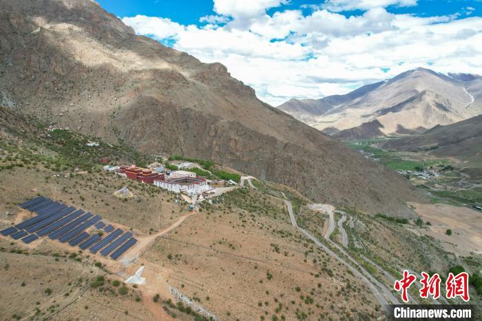 5月29日,航拍拉薩乃朗寺光伏電站,該電站年發電量約100萬千瓦時,并配備光儲充一體化系統,可完全滿足寺廟的使用需求。(無人機畫面)中新社記者 江飛波 攝