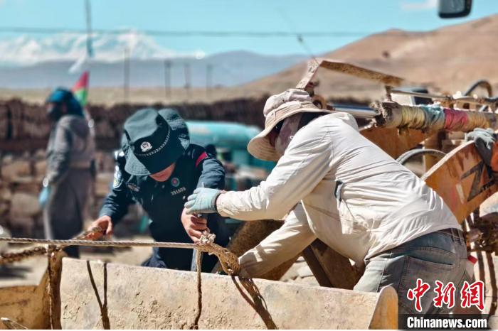 圖為西藏出入境邊防檢查總站第十四批駐村工作隊(duì)隊(duì)員與當(dāng)?shù)卮迕窆餐_展災(zāi)后重建。徐廣立 攝