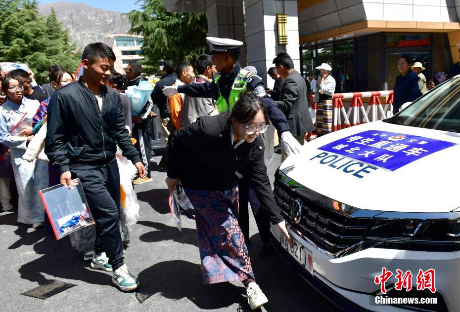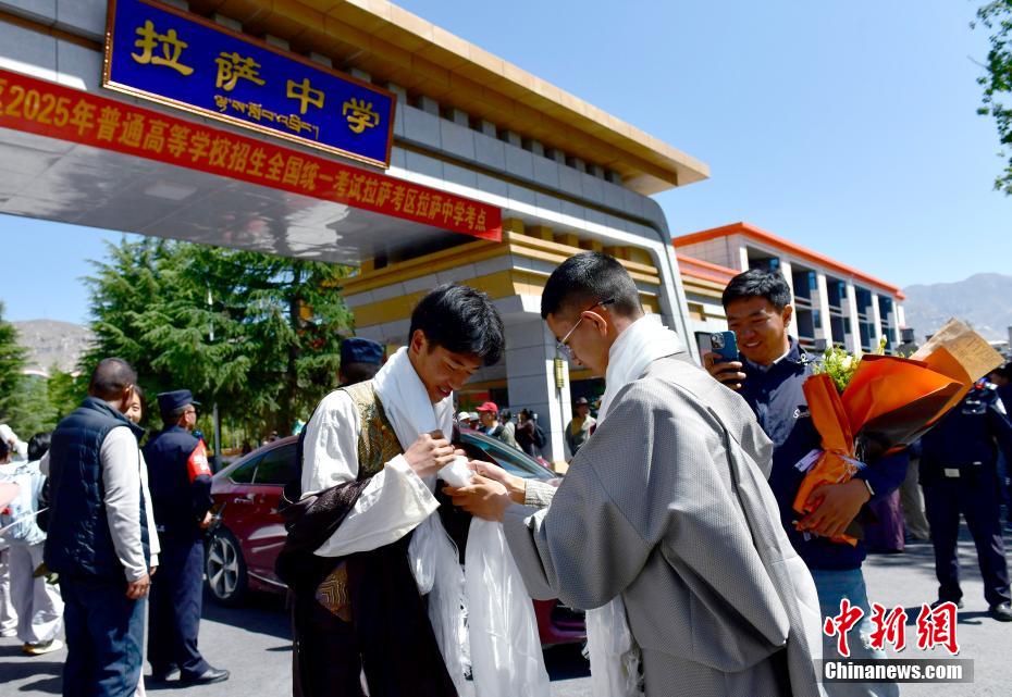 6月9日,西藏拉薩江蘇實驗中學考點外親友為考生送上哈達。當日,西藏自治區2025年普通高考完成所有科目考試,2025年西藏高考落下帷幕。中新社記者 貢嘎來松 攝